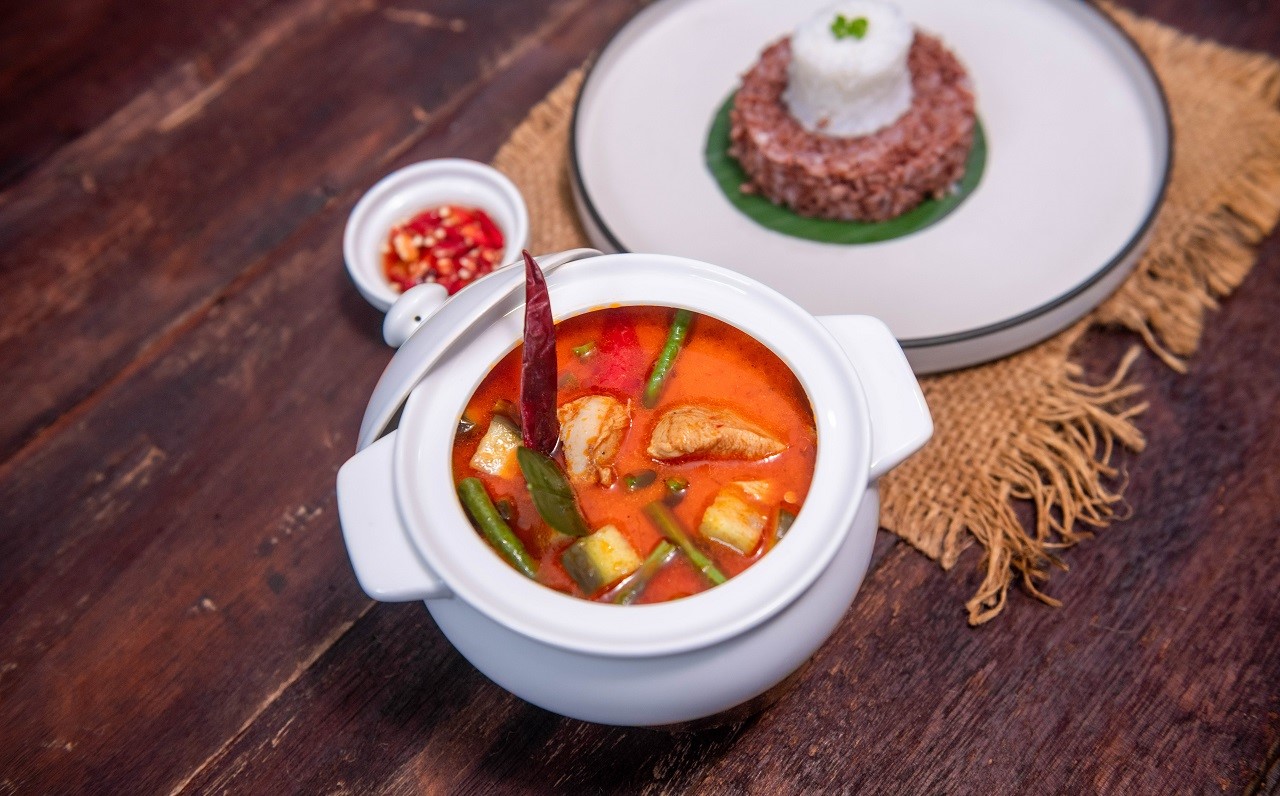 Popular Throughout the Kingdom, This Curry is Distinct from its Counterparts in Neigh bouring Countries. Its Exhibits a Balance of Mild and Subtle Flavors, Including Curry Paste, Chicken, Potato Sweet, long Bean, Onion and Eggplant