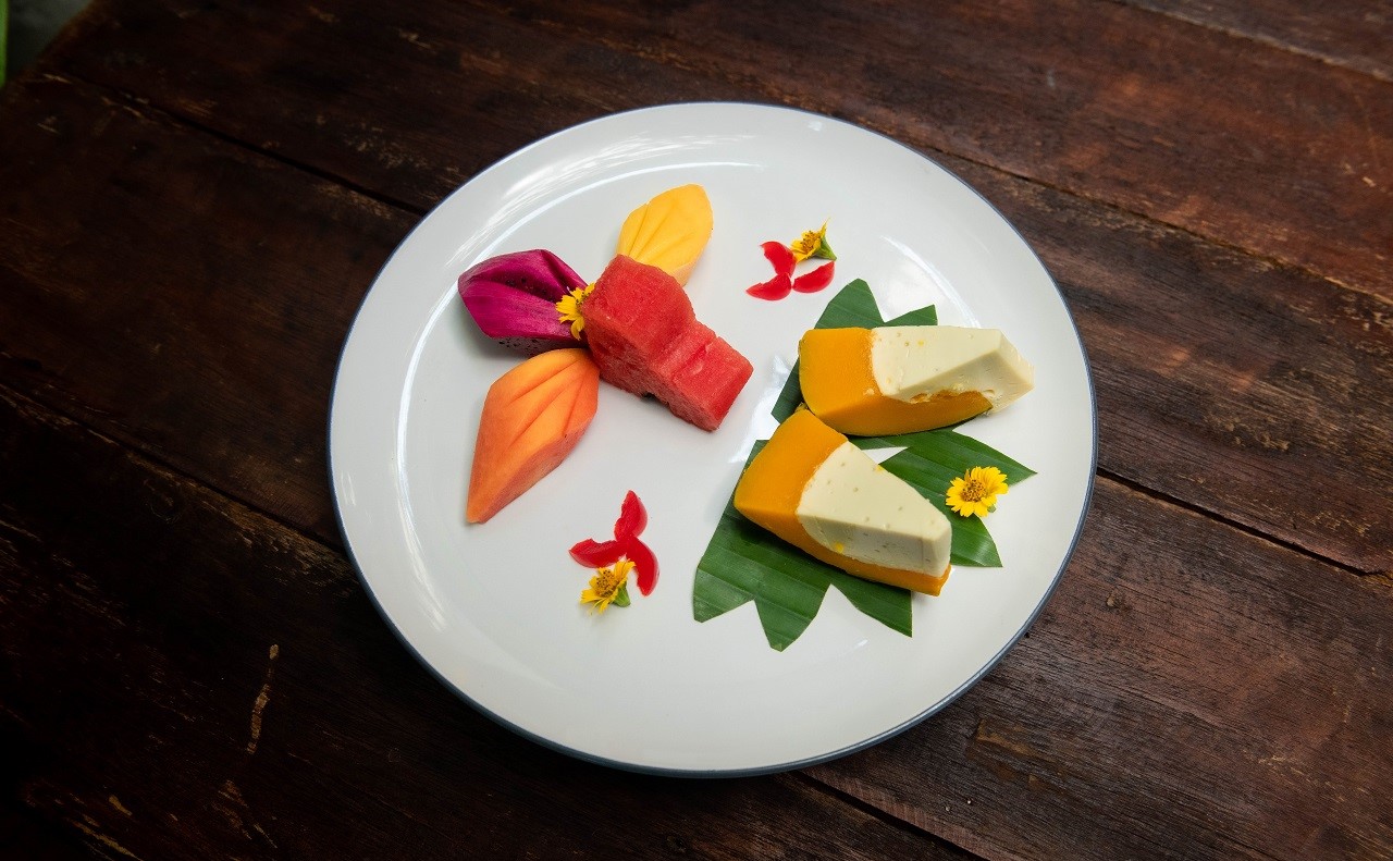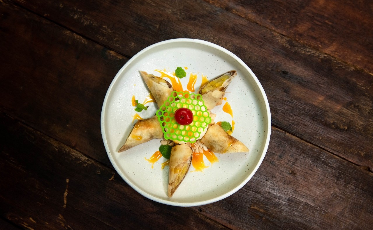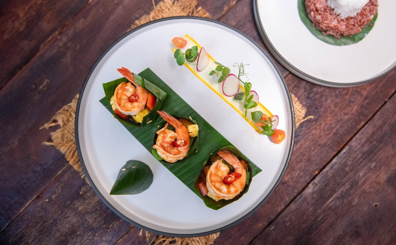Mango green, Dried smoked fish, Crushed peanuts, Mixed local herbs wrap with banana leaf Served of Khmer Dressing