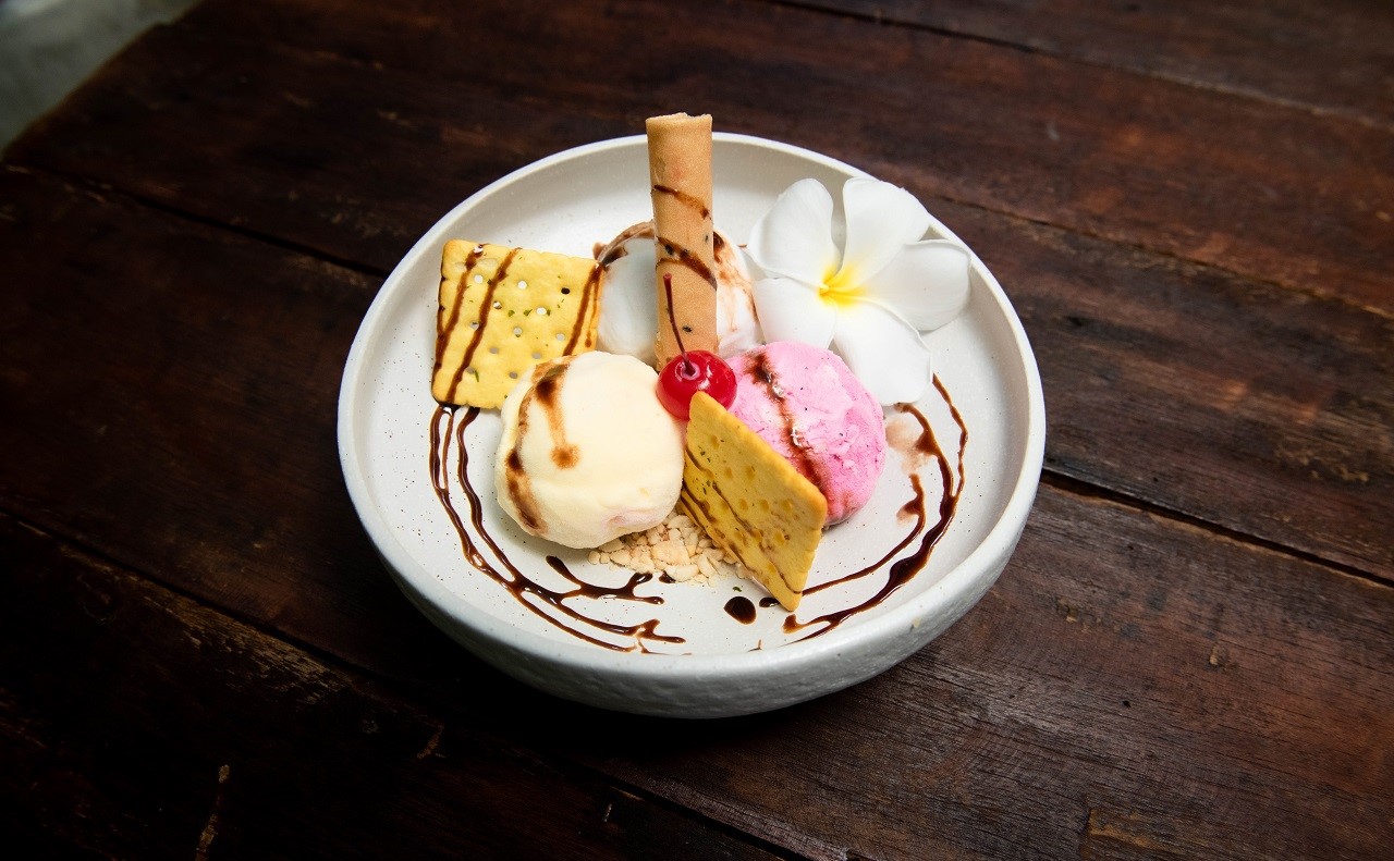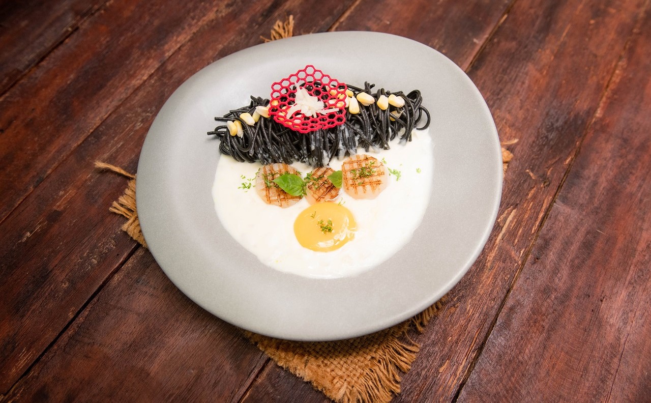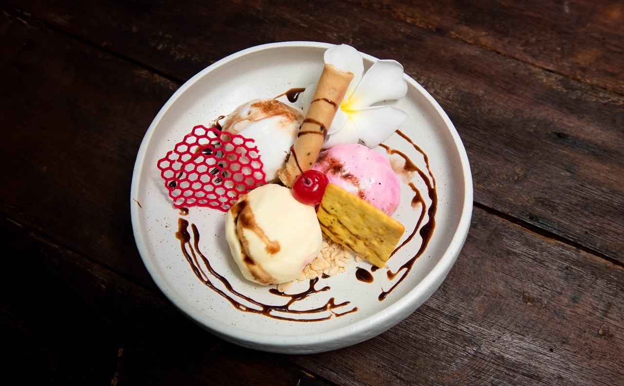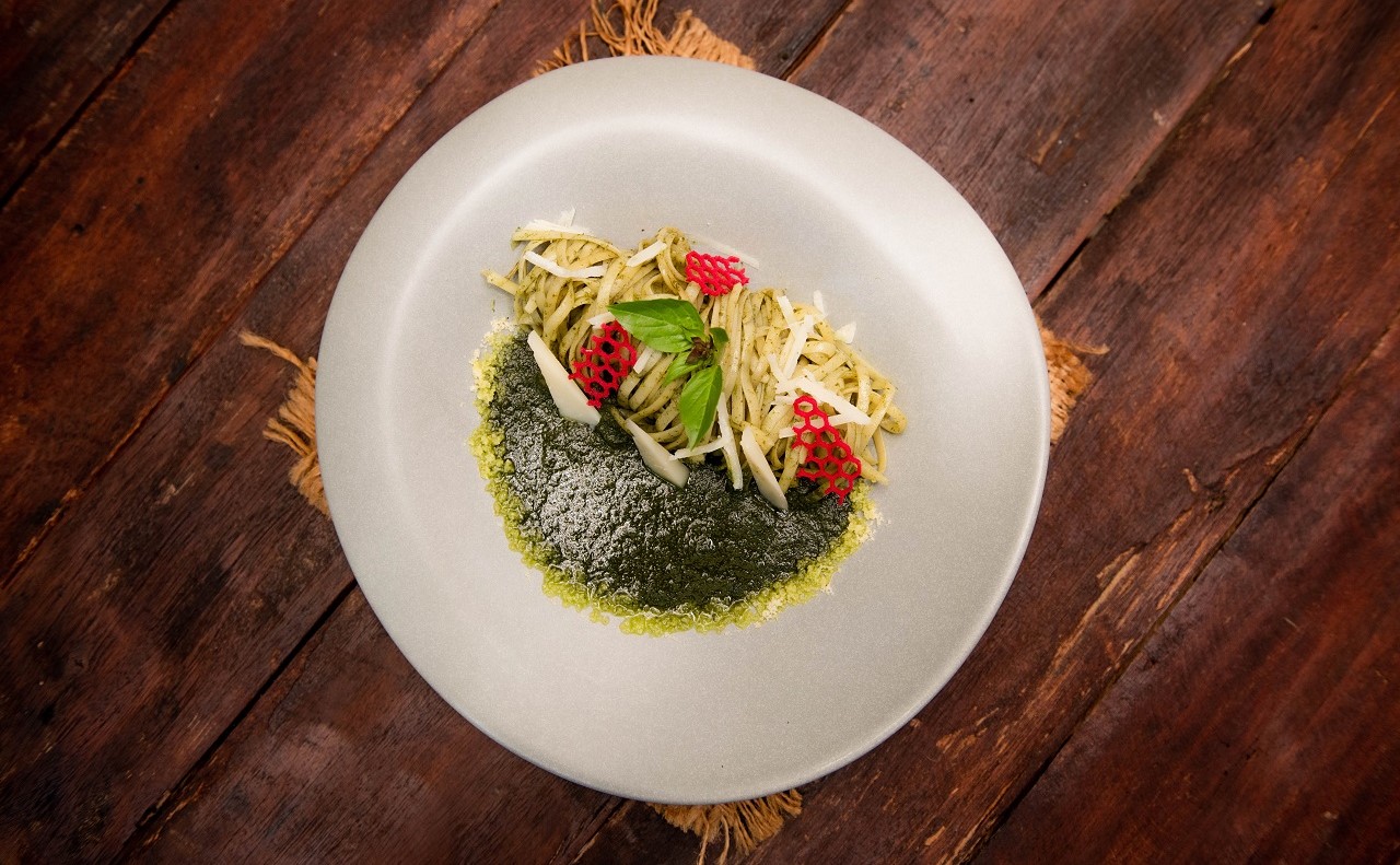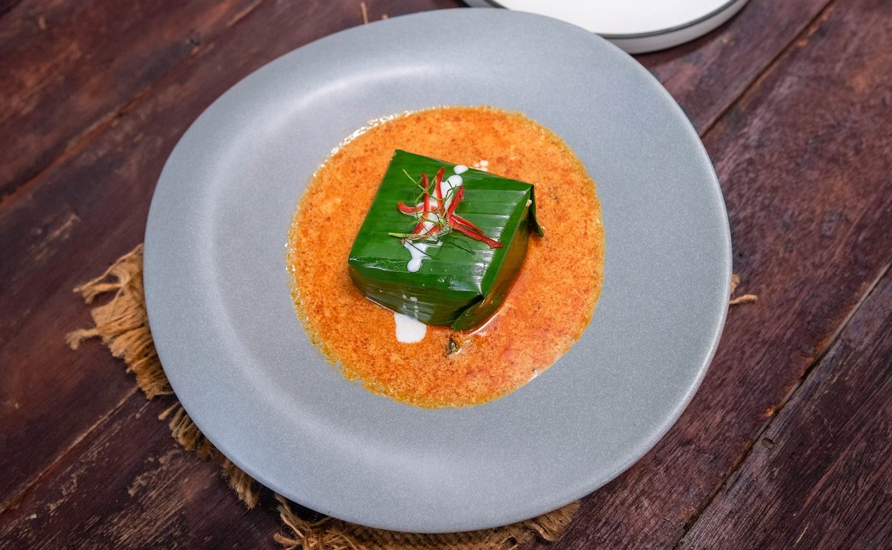 The Traditional Cambodian Fish Amok Steamed with Chicken egg, Homemade Amok paste, Chopped Noni Leave Served in a Banana Leaf basket topped with Coconut Cream and Julienne Kaffir Lime Leaves,