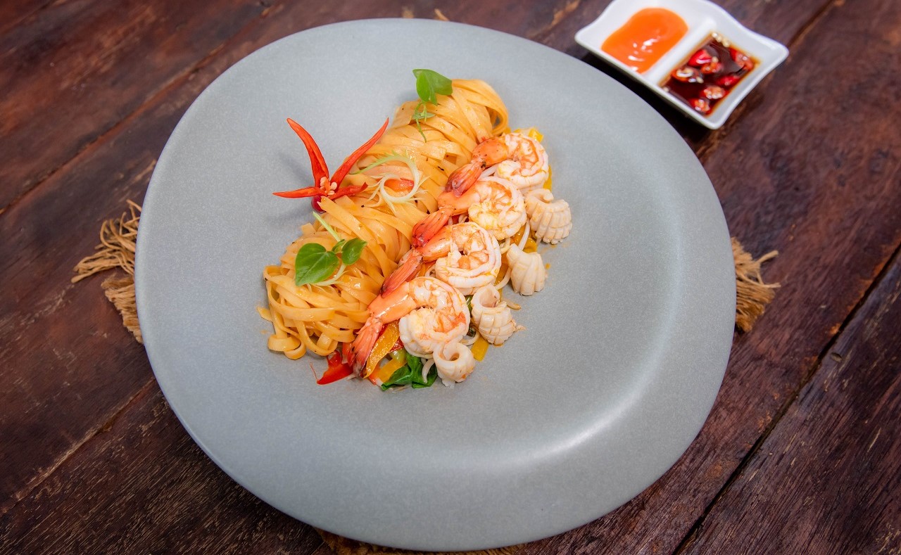 Stir-Fried Yellow, Flat or Rice Noodle with Choice of Beef, Pork, Chicken or Seafood. The Dish Accompanied with Soya Sauce, Chili Sauce and a lime Wedge