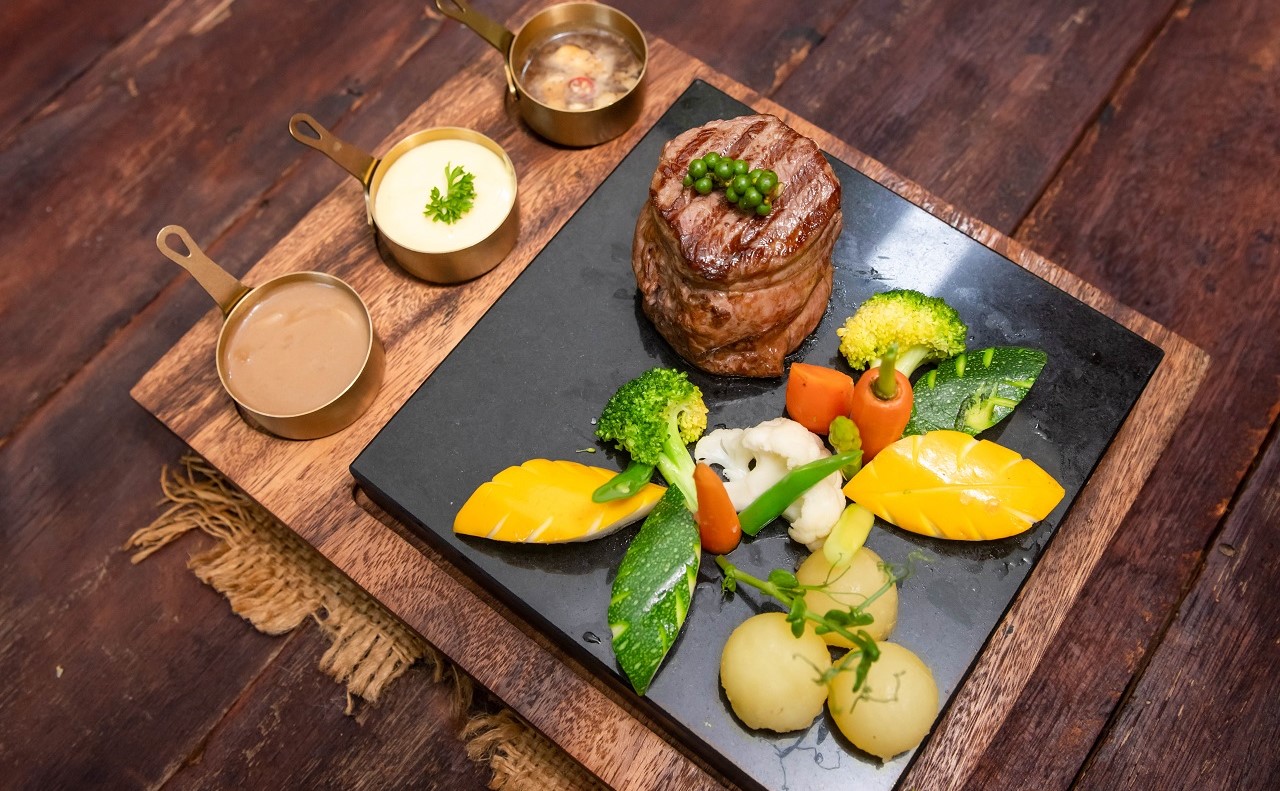 Grilled Juicy Australian Beef Tenderloin Accompanied with Sauteed Baby Potatoes, Buttered Vegetables Served with Bearnaise Sauce. Pepper dip sauce, Mushroom sauce