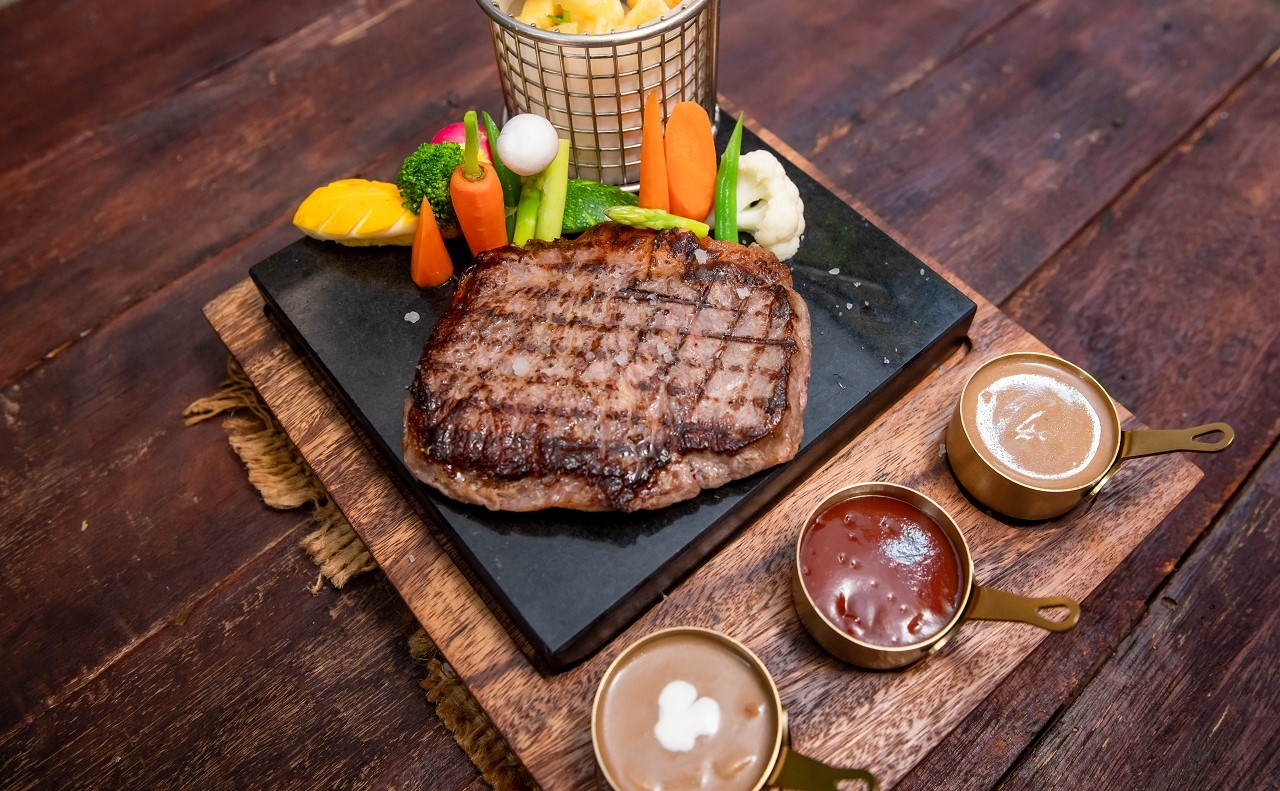 Australian Beef rip-eye steak,French fried, Glazed Vegetables Served with red wine sauce, mushroom sauce, tomato ketchup