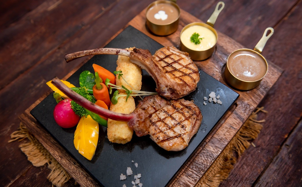 Grilled Pork Chop, Potato Croquettes, Green Bean, Carrots Served with Dijon Mustard Sauce