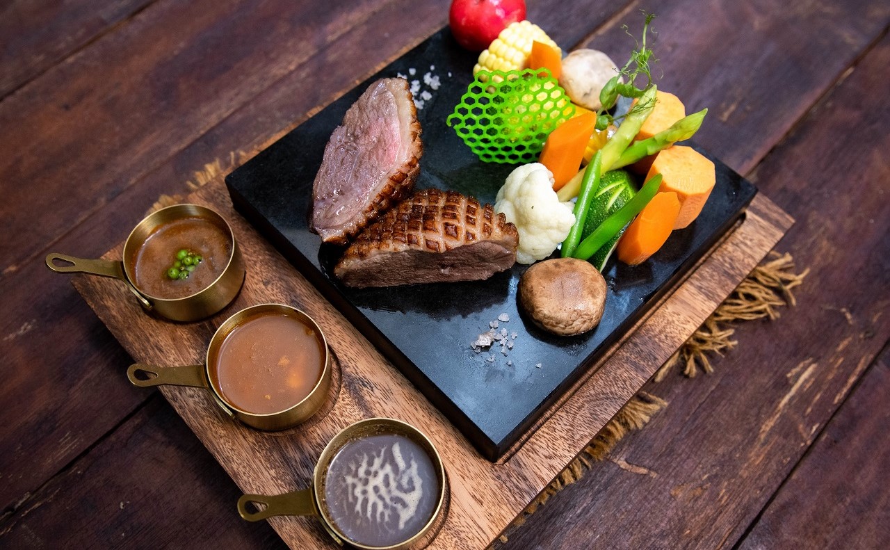 Grilled French Rouge Brand Duck, sweet fondant potato , Mixed green vegetables served with green pepper sauce, Orange sauce, salt and pepper dip