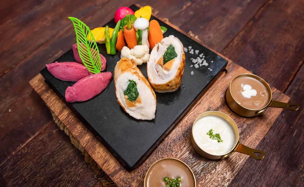 Grilled Stuffed Chicken Breast, Meringue Sausage, Spinach, Carrot, Masted purple Potato, Asparagus and Served with mushroom Cream sauce,