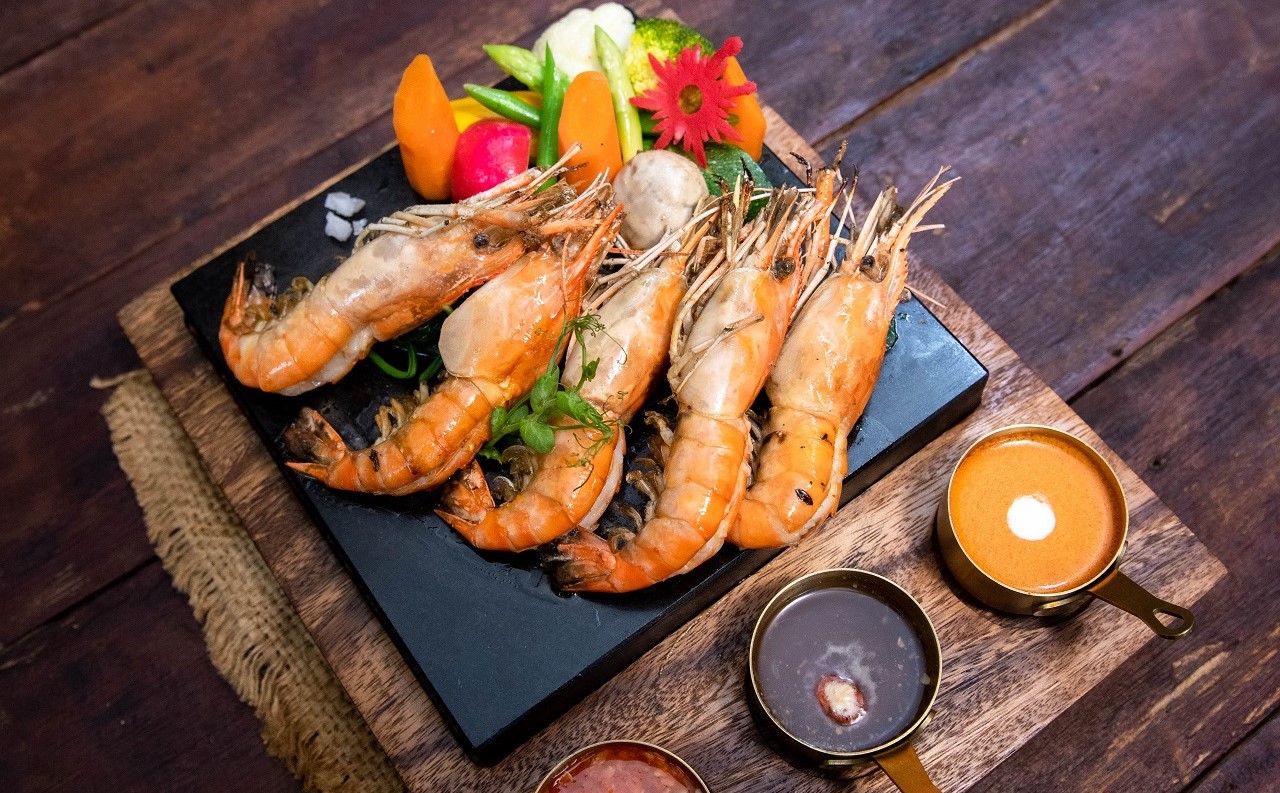 Sihanouk ville King Prawn Served with Butter Brown Rice, Seasonal Vegetable and Curry Sauce, Khmer hot spicy sauce, salt and pepper dip