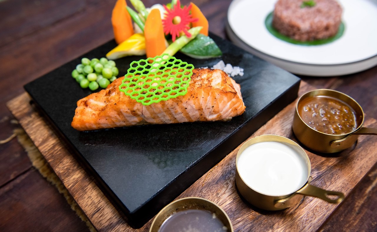 Grilled Norwegian salmon served with Brown Rice , Green Peas, Mixed vegetable and Orange Grain Mustard Sauce. White wine sauce, Pepper lime juice sauce