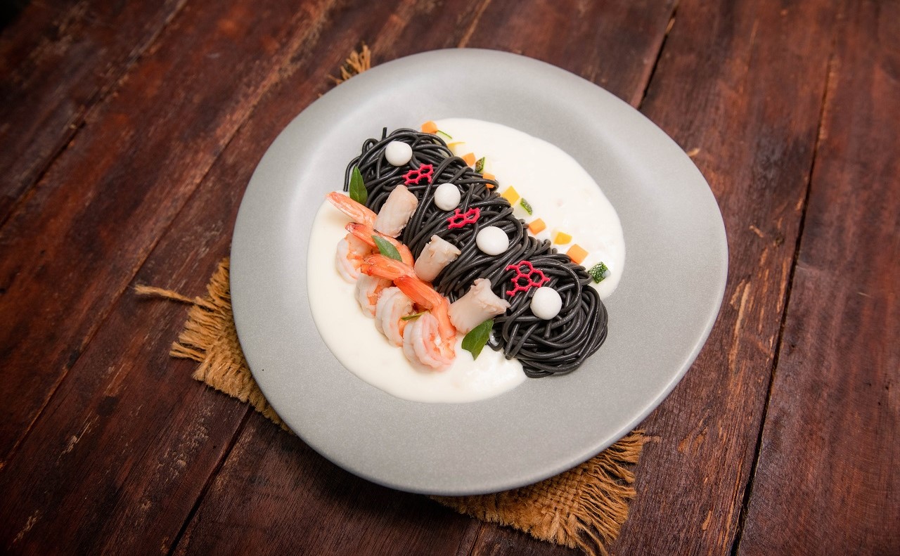 Slightly Sour Soup of Prawn and Squid Cooked in Coconut Juice, Spicy Paste, Kaffir Lime Leaves, Straw Mushroom, Galangal, Cherry Tomato and Fresh Local Herbs