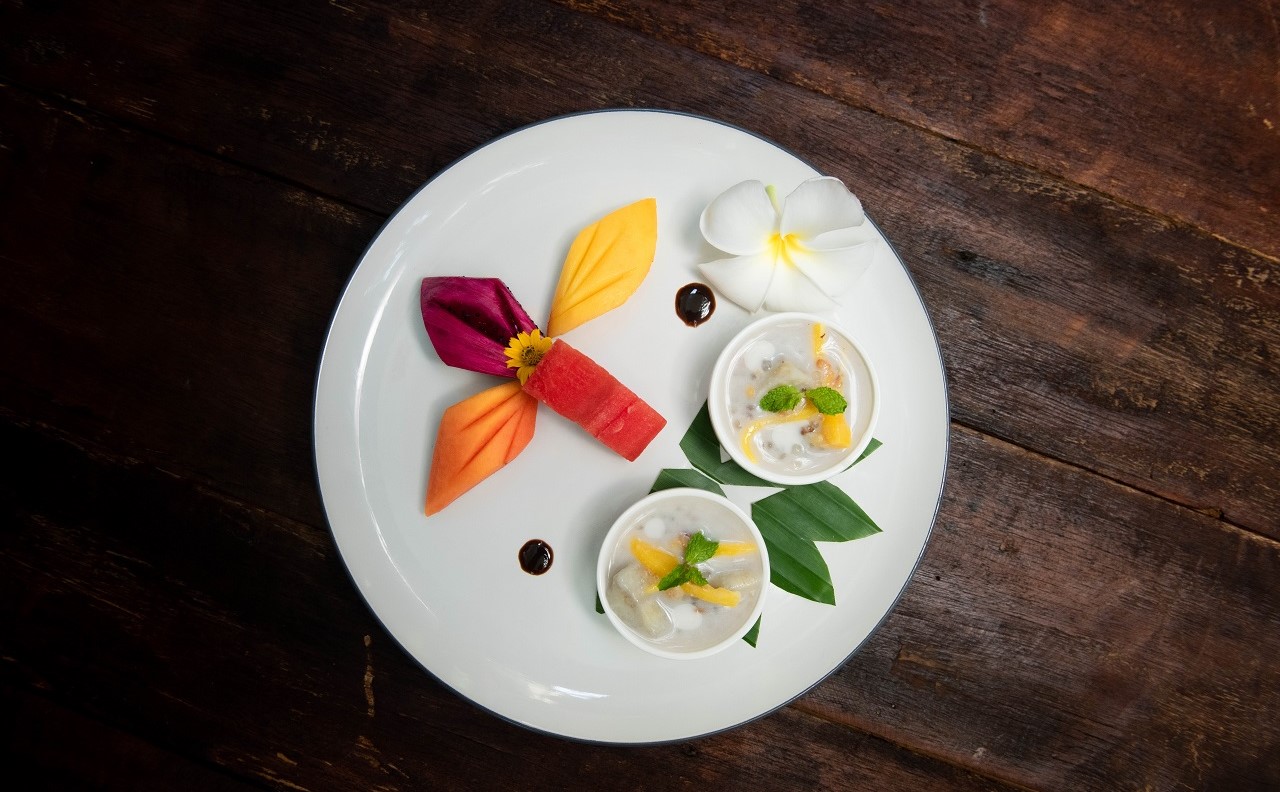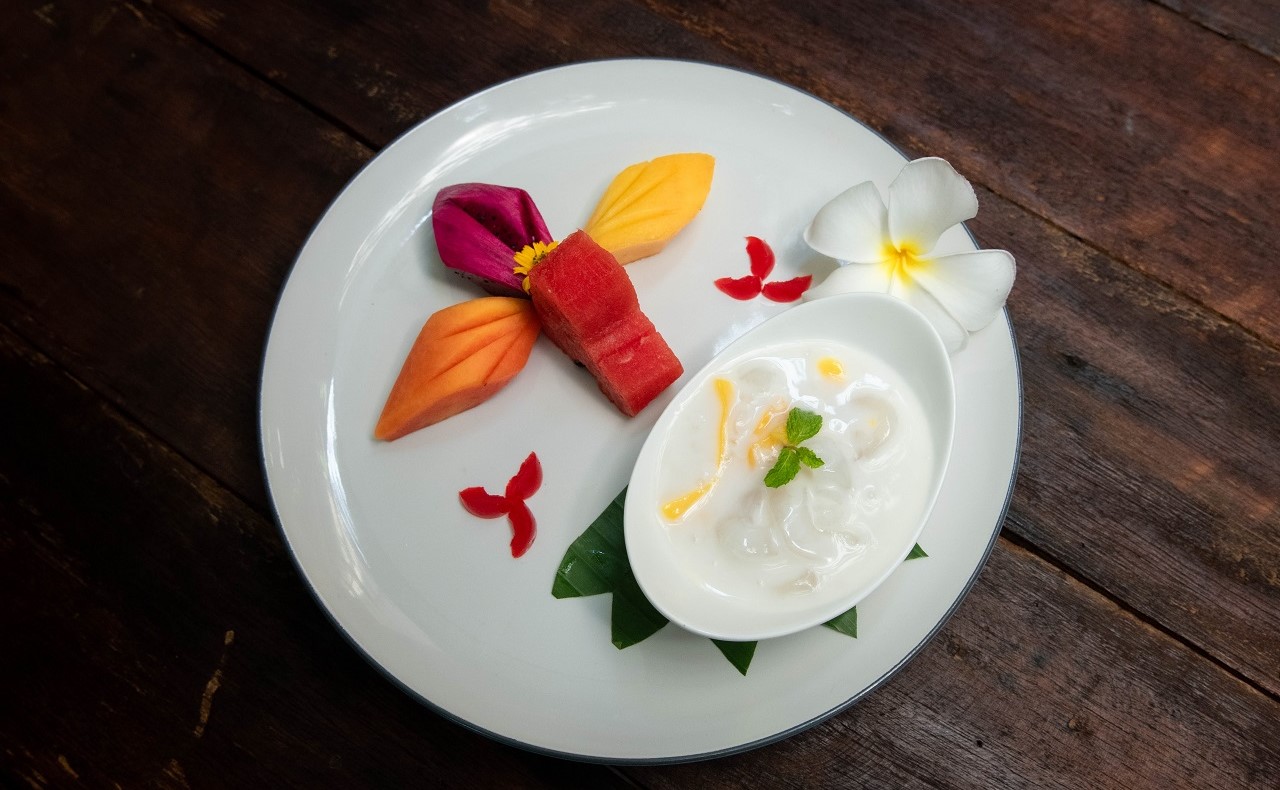 Pomelo Fruit, Carrot, Three Kind of Bell Pepper, Tomato red sliced, Tossed shredded Coconut and Khmer Dressing